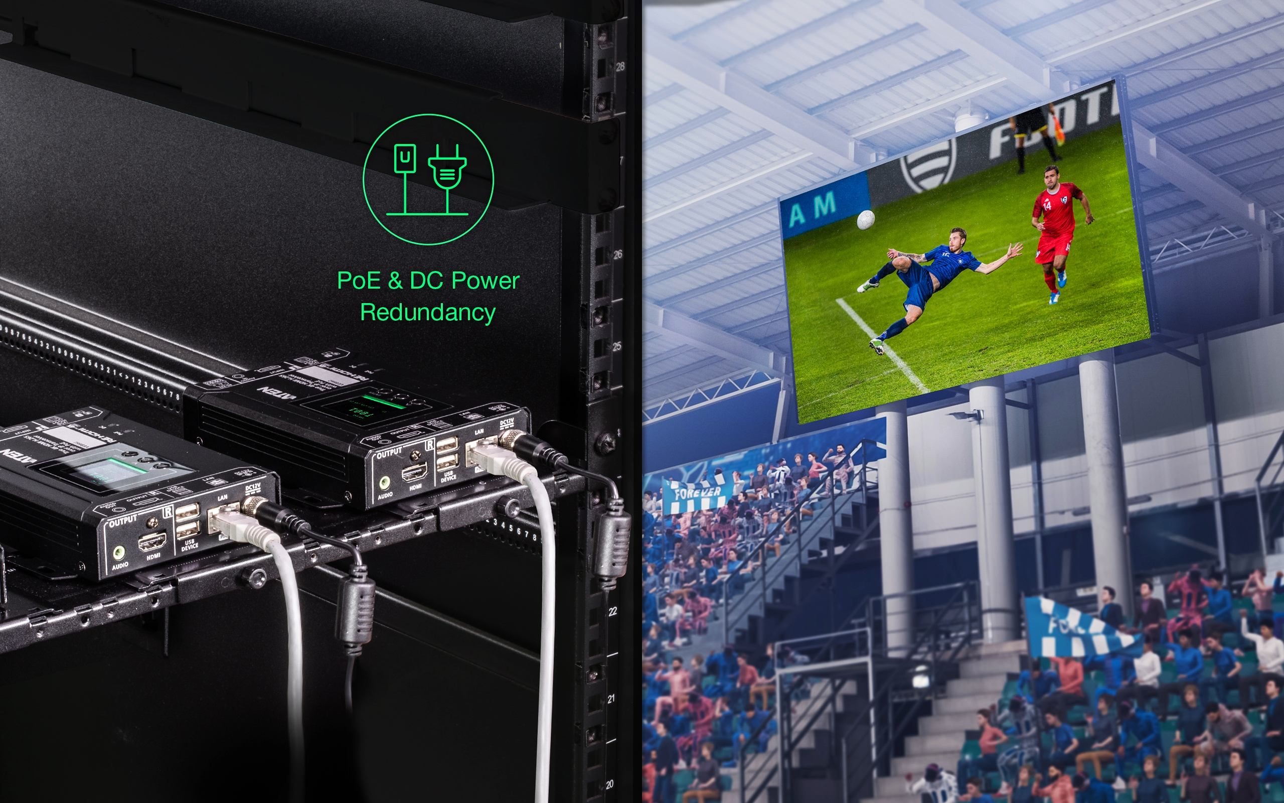 Для достижения максимальной стабильности в VE8662 применено резервирование питания с помощью функции PoE (Power over Ethernet) и подачи питания от источника постоянного тока, что обеспечивает безотказную работу аудио-видео системы при сбоях электропитания.