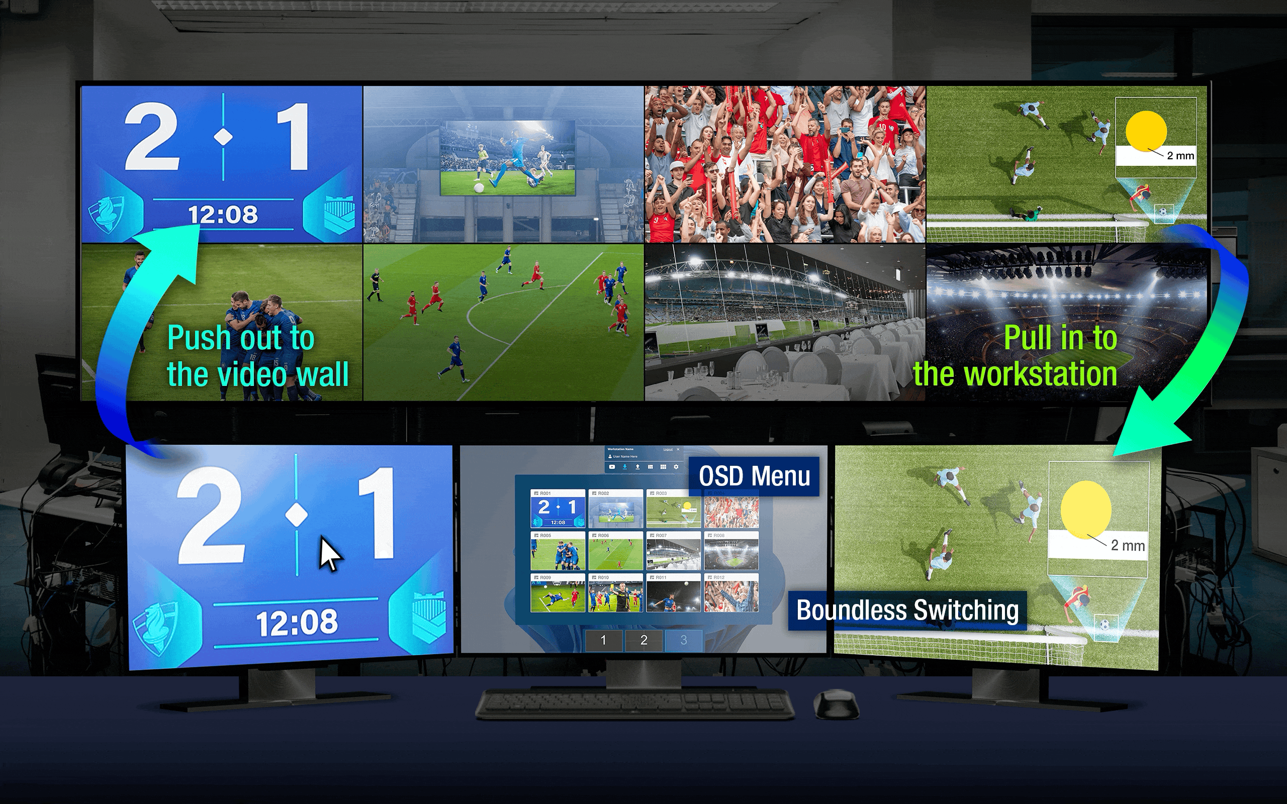 Для улучшения распределения видео и оптимизации совместной работы операторы, используя гибкие возможности функций "push" или "pull", а также KVM-управления с экранным меню (OSD), могут эффективнее работать с материалами на видеостене, выбирая источник интуитивно понятным путем и удобно управляя видеопотоком. Кроме того, воплощение технологии безграничного переключения (Boundless Switching) позволяет легко переключаться между источниками видео простым перемещением курсора мыши по экранам, тем самым улучшая ситуационную осведомленность и принятие обоснованных решений в режиме реального времени.