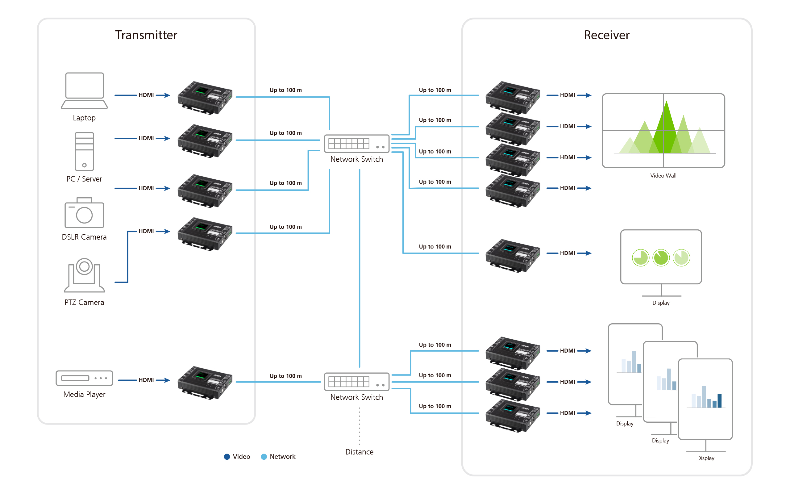 VE8662 представляет собой решение для масштабируемой передачи видео по IP-сети, легко интегрируемое в локальную сеть, поддерживающее многоадресную потоковую передачу и масштабируемое каскадирование. Это обеспечивает гибкость и удобство выполнения динамической настройки аудио-видео систем в любое время.