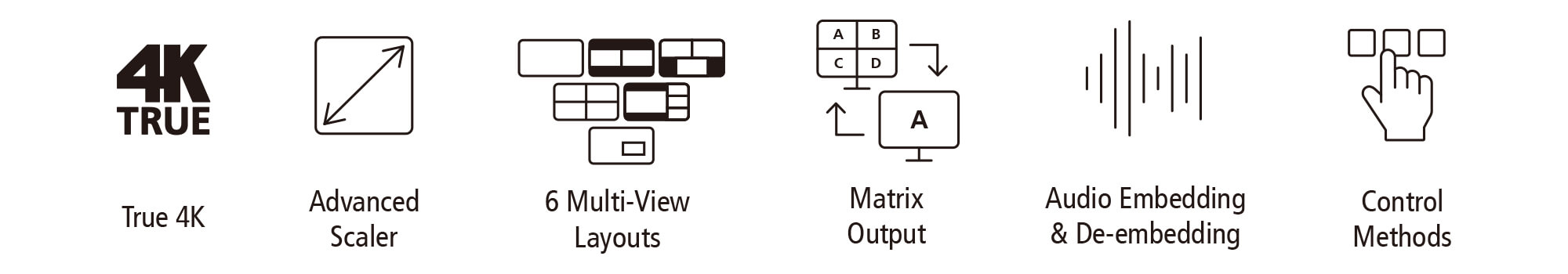 Поддержка разрешения True 4K при 60 Гц обеспечивает высокую детализацию изображений и сложных визуальных эффектов. Усовершенствованный масштабатор (скейлер) без проблем обрабатывает большинство распространенных входных разрешений от 1080P до True 4K, обеспечивая быстрое и плавное переключение источников изображения с разным разрешением.