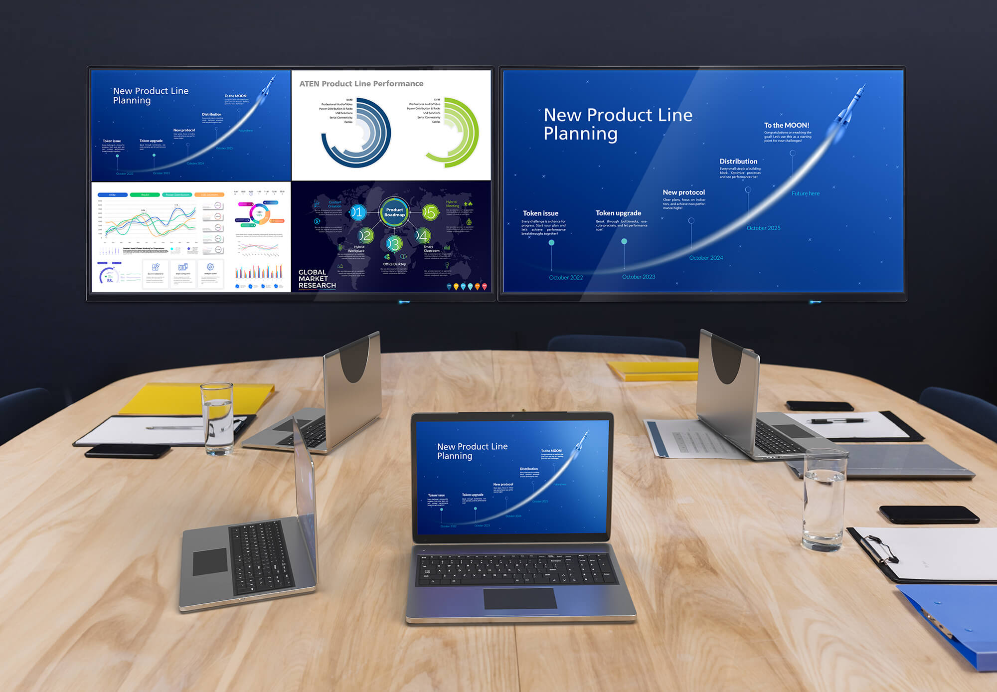 Возможность одновременной трансляции на одном экране изображений от 4-х источников поможет расширить возможности совместной работы. Параллельное сравнение данных и обмен идеями между несколькими участниками повышают эффективность командной работы и принятия решений. Для непрерывного и динамичного отображения в любое время в существующий макет могут быть интегрированы новые видеоисточники.