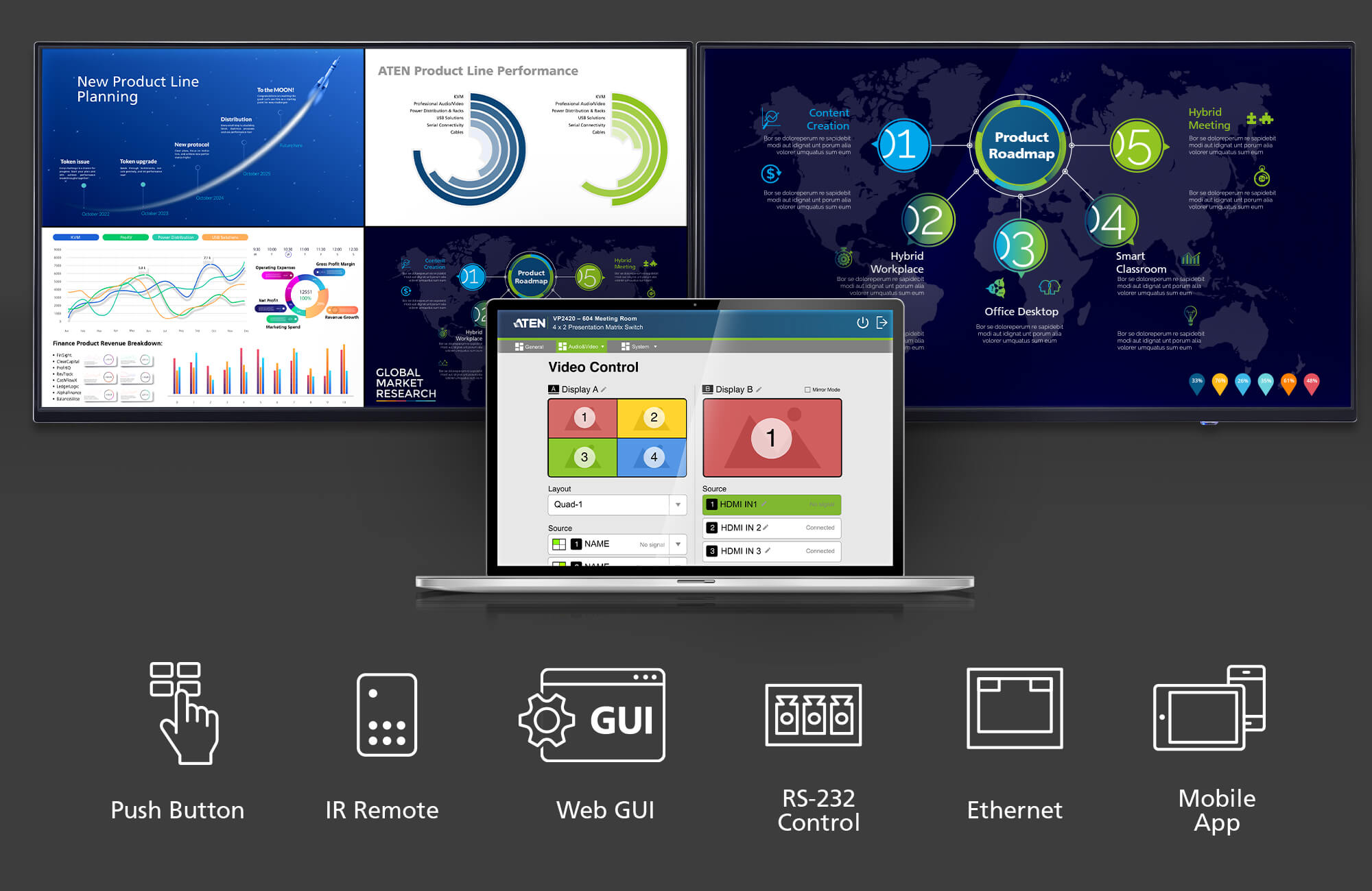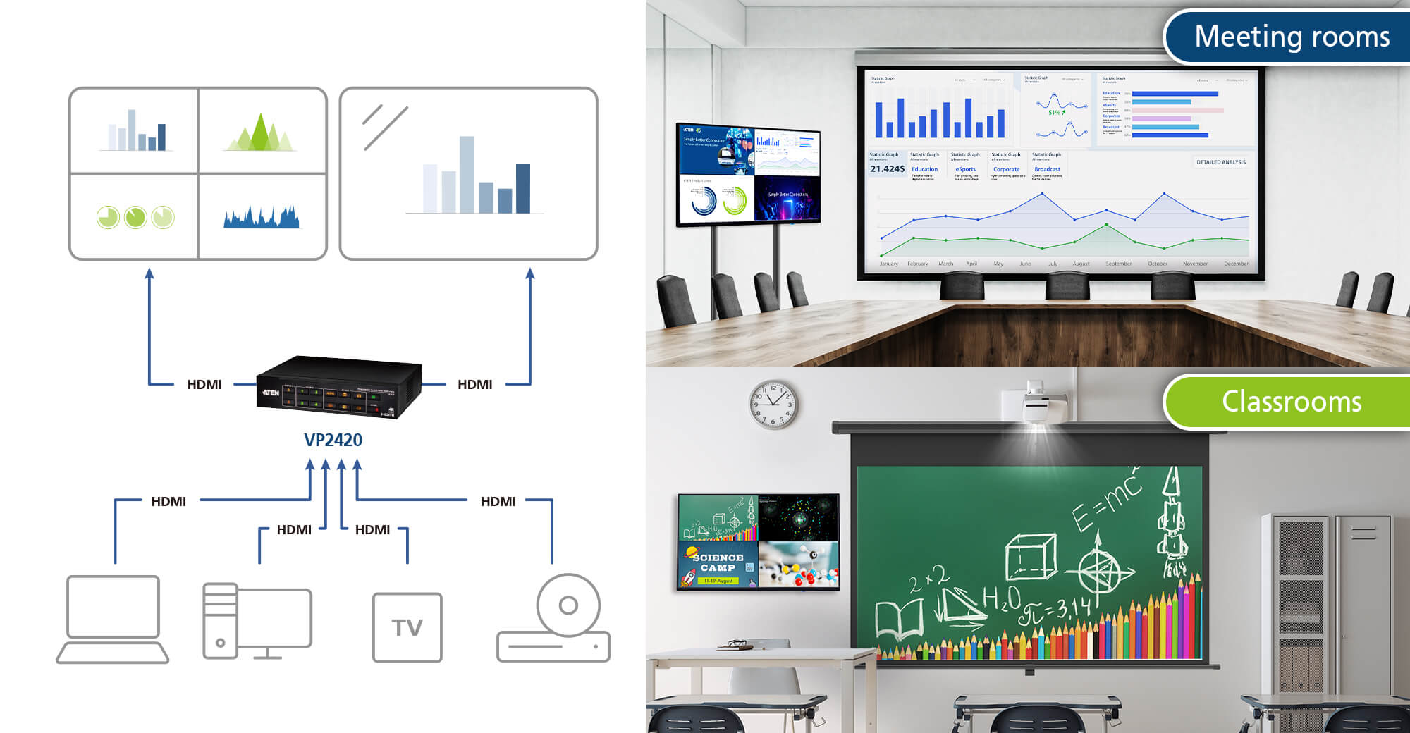 True 4K HDMI презентационный коммутатор с функцией Multi View (просмотра нескольких видеопотоков) модели VP2420 компании ATEN. Возможность просмотра двух изображений на двух дисплеях с разным разрешением сочетается с плавным переключением источников. Благодаря функции Multi View участникам встречи предоставляется возможность транслировать одновременно на одном экране изображения от нескольких источников. Постоянное отслеживание подключения или отключения источников обеспечивает плавность работы и бесперебойность проведения совещаний. VP2420 оснащен возможностью встраивания и извлечения звука. Презентационный коммутатор VP2420 может использоваться как автономно, так и интегрироваться с системами управления. При этом поддерживается возможность подключения каскадом 4 дополнительных презентационных коммутаторов. Все это, наряду с простым управлением отображением источников сигнала, позволяет сделать каждую презентацию увлекательной, непрерывной и эффективной.