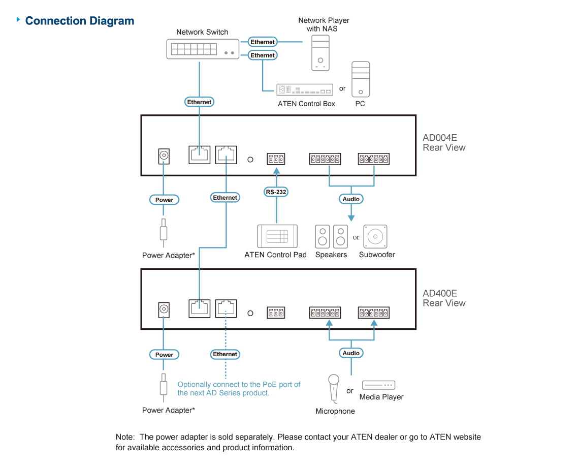 AD400E не только улучшает взаимодействие между устройствами для AoIP (распространение цифрового звука по IP-сети) и выполняет эффективное предусиление. При совместном использовании с продуктами профессионального звука компании ATEN устройство позволяет сочетать возможности DSP-технологий и архитектуру распределенных аудиосистем для повышения гибкости размещения устройств, снижения общей стоимости решения и расширения области применения. Он подходит для профессиональных сфер, использующих сетевую технологию Dante, например, конференц-залов различного размера или мест приема гостей, таких как рестораны и бары.