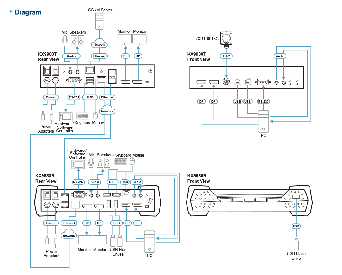 Являясь матричным решением на основе IP-подключения, KX9980R может использоваться в качестве удлинителя, работающего в режимах "точка-точка" / "точка-многоточка" / "многоточка-точка", или интегрироваться в матричную KVM-систему с доступом по IP (режим "многоточка-многоточка") в сочетании с программным обеспечением для управления KVM over IP Matrix Manager (CCKM), дающим возможность наиболее гибкого применения в различных рабочих средах.