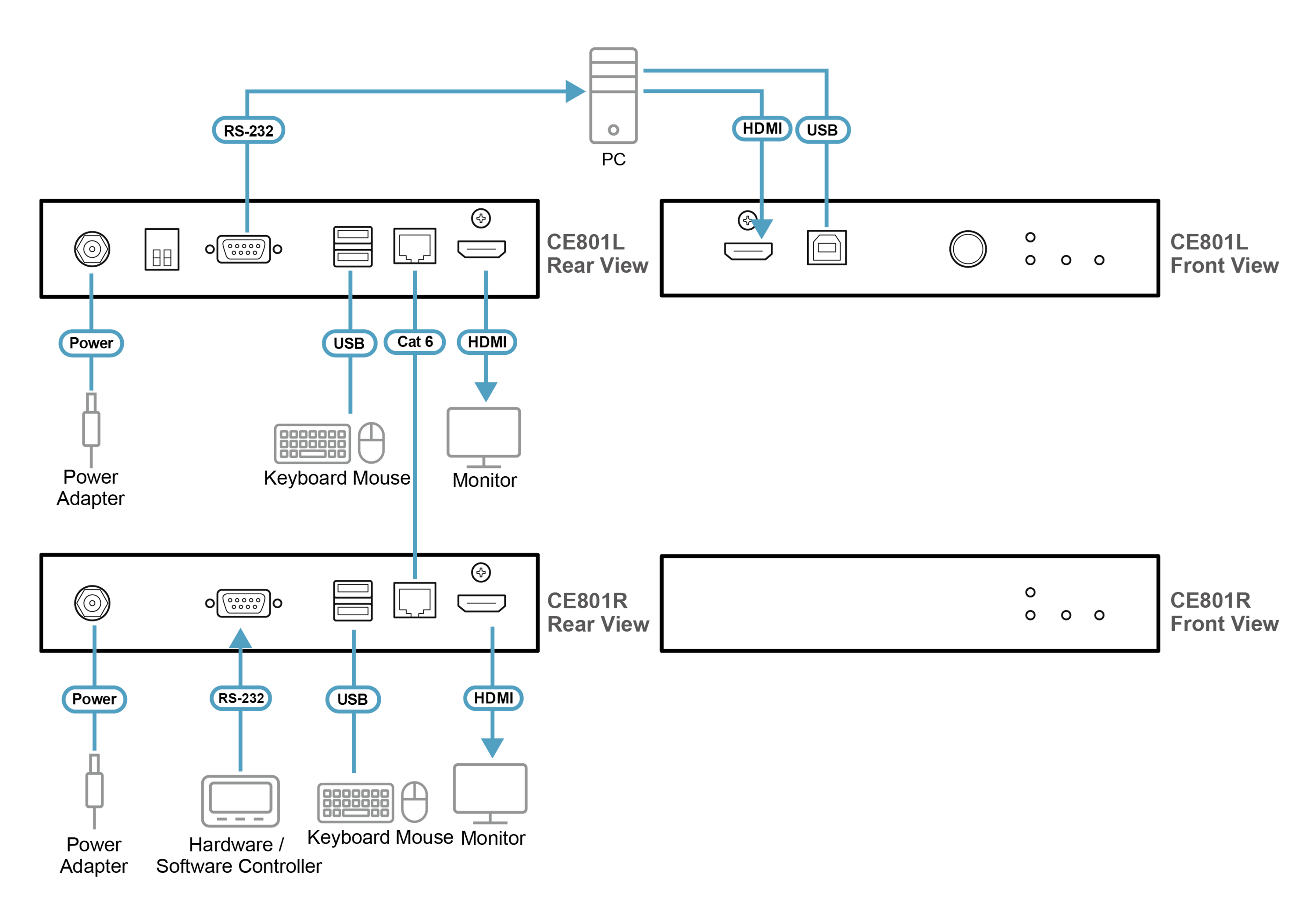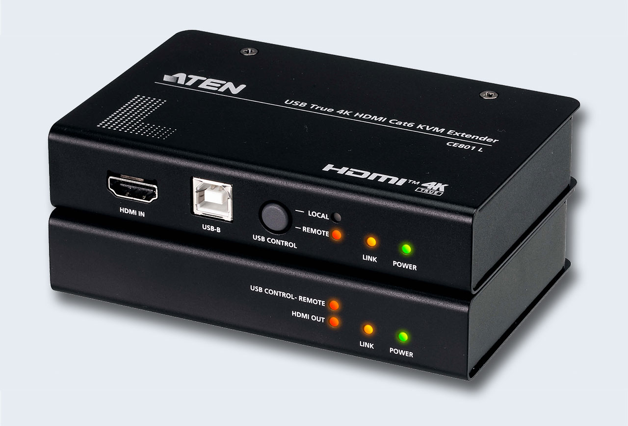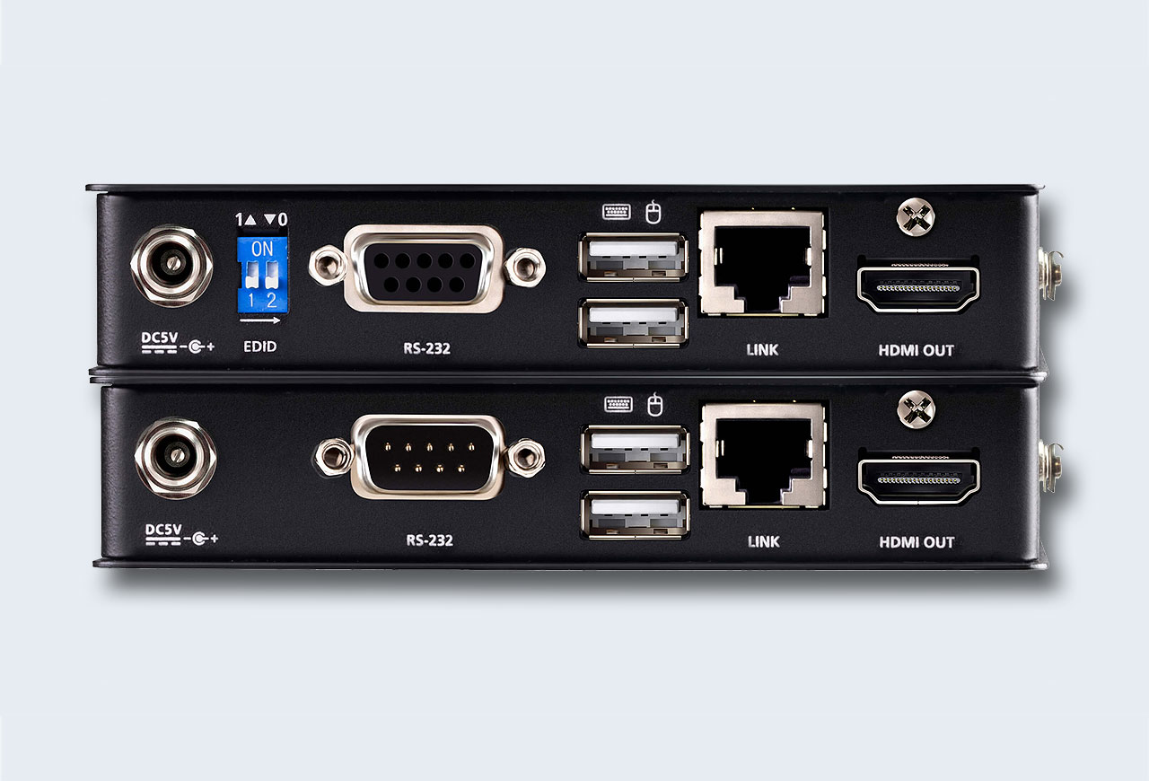 CE801-AT-G — KVM удлинитель с передачей сигналов HDMI, USB, RS232 по витой паре Cat6, на расстоянии до 70 м с разрешение м True 4K (3840 x 2160 @ 60 Hz 4:4:4) или до 100м и разрешением 1080p. Устройство обеспечивает работу ПК(серверм) с двух KVM консолей (локальной и удаленной).