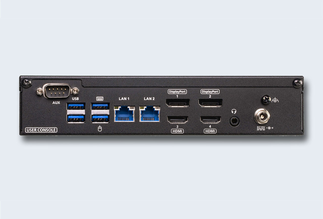 Порты консоли | 2 x гнезда USB тип A (синего цвета) 2 x гнезда DisplayPort (черного цвета) 2 x гнезда HDMI (черного цвета) 1 x линейного аудиовыхода/входа (черного цвета) 1 x разъем DB-9 (черного цвета) |